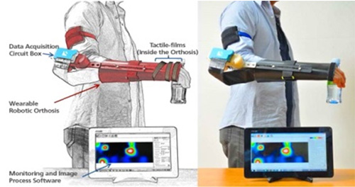 HSTS, a higher sensitivity tactile-film system for wearable orthosis that can suppress tremors and support voluntary movement at the elbow. |